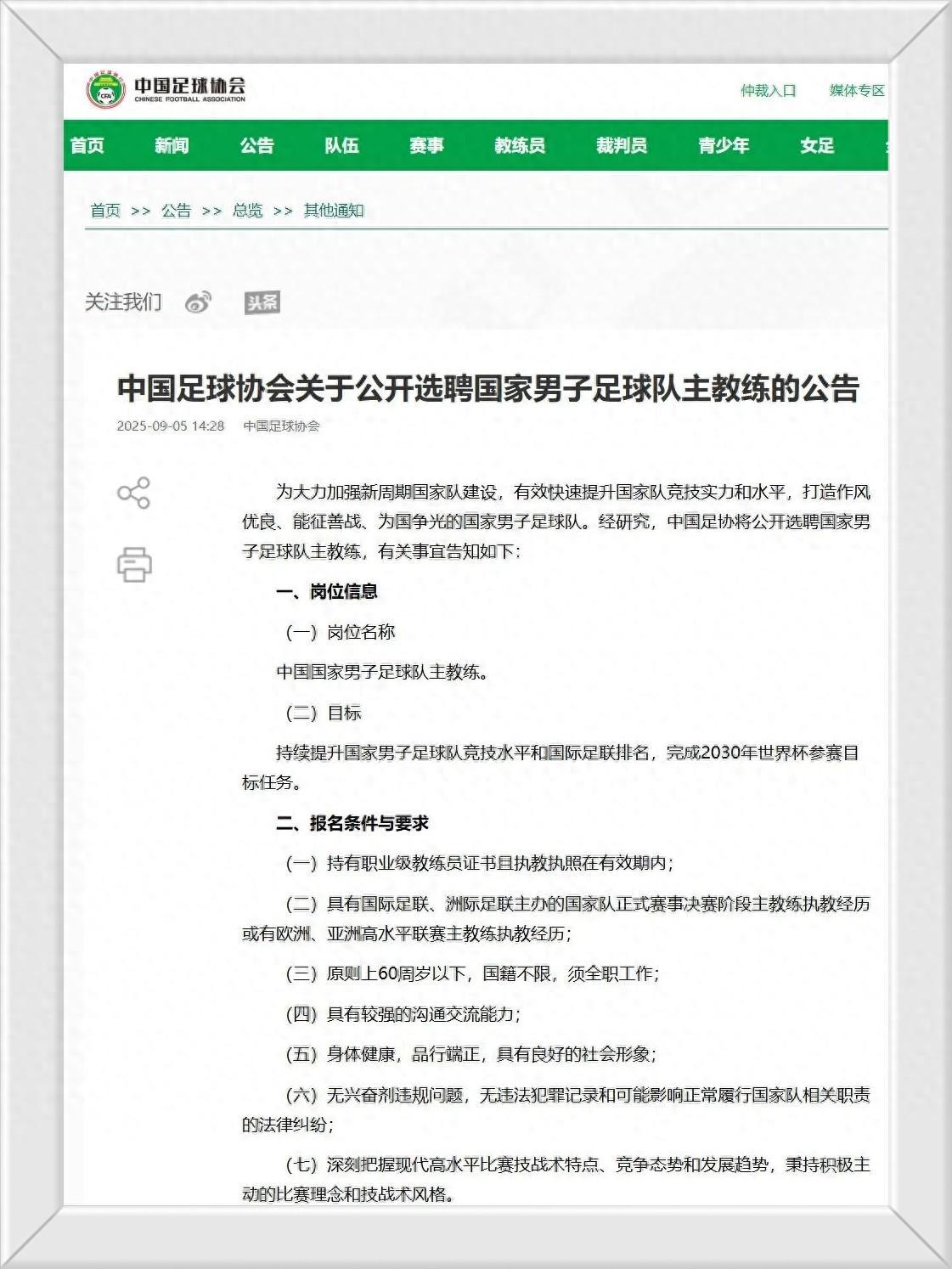 值此之际,北京时间9月5日下午14点30分左右,中国足协官方网站,再次公布一则关于中国公开选聘国足主教练的公告。